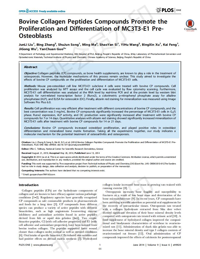 牛骨膠原蛋白肽促進MC3T3-E1成骨細胞增殖和分化