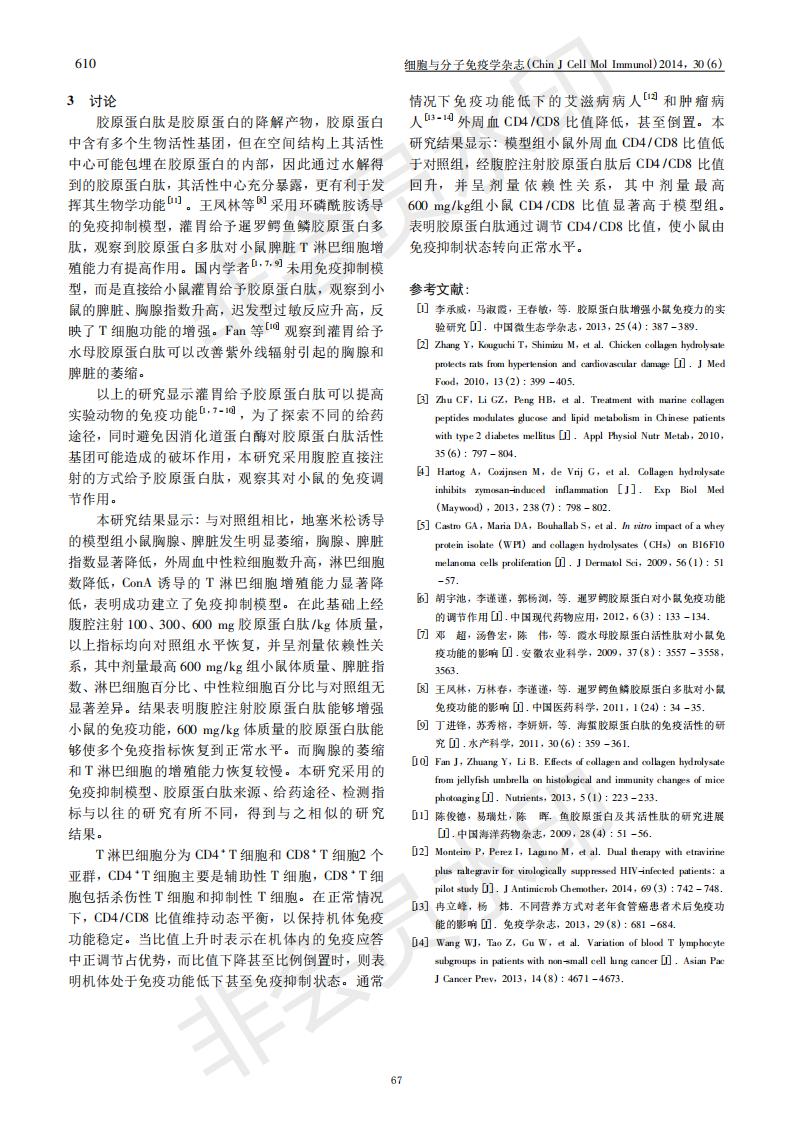 腹腔注射膠原蛋白肽增強(qiáng)糖皮質(zhì)激素免疫抑制模型小鼠的免疫功能