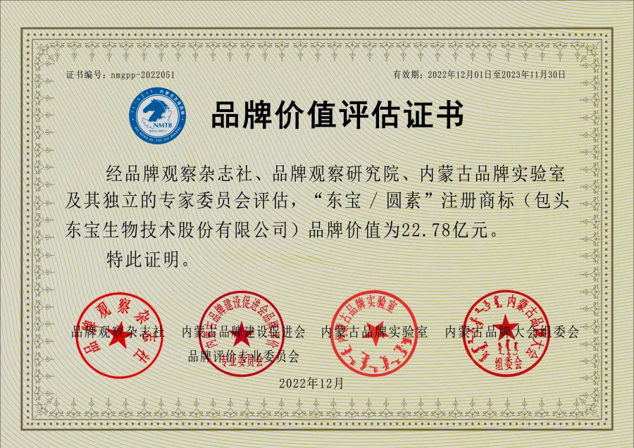 2023年1月,由內(nèi)蒙古品牌建設(shè)促進(jìn)會主辦,內(nèi)蒙古品牌大會組委會、內(nèi)蒙古品牌評價專業(yè)委員會、內(nèi)蒙古知名品牌認(rèn)定委員會承辦的“2022年度內(nèi)蒙古品牌價值評價信息宣介發(fā)布會”在呼和浩特隆重召開。發(fā)布會上不僅公布了東寶生物榮獲2022年度“內(nèi)蒙古百強品牌企業(yè)”、“內(nèi)蒙古品牌建設(shè)標(biāo)桿企業(yè)”等稱號,還對“東寶/圓素”進(jìn)行了品牌價值評估認(rèn)證。