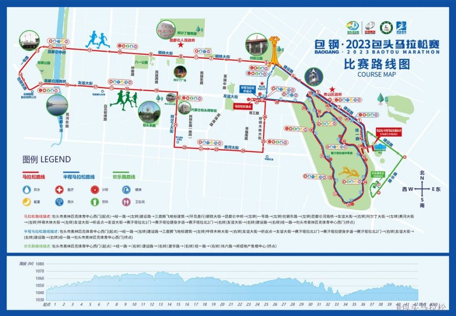 圓素提示:包頭馬拉松賽將于6月23日7點30分開跑,所有參賽選手領(lǐng)取物料時間為6月20日(周二)9:00 — 18:00、6月21日(周三)9:00 — 18:00、6月22日(周四)9:00 — 21:00,地點為包頭奧林匹克體育中心(北門),比賽路線圖如下: